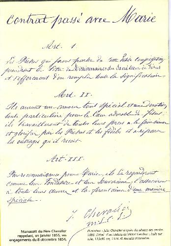 Un año más tarde Julio Chevalier, recordando las promesas que hiciera al comenzar la novena a la Virgen María que culminaría en la fundación, anotó este contrato con María.