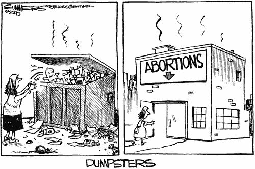 Adivinanza cruel. Adivine la diferencia entre las dos caricaturas. A la primera la meten en la cárcel y a la segunda que va a abortar le dicen que tiene el derecho de elegir. La incoherencia criminal número 2 de los modernos. El efecto final no es distinto. Los dos terminan en la basura. Esto es una especie de demencia.
